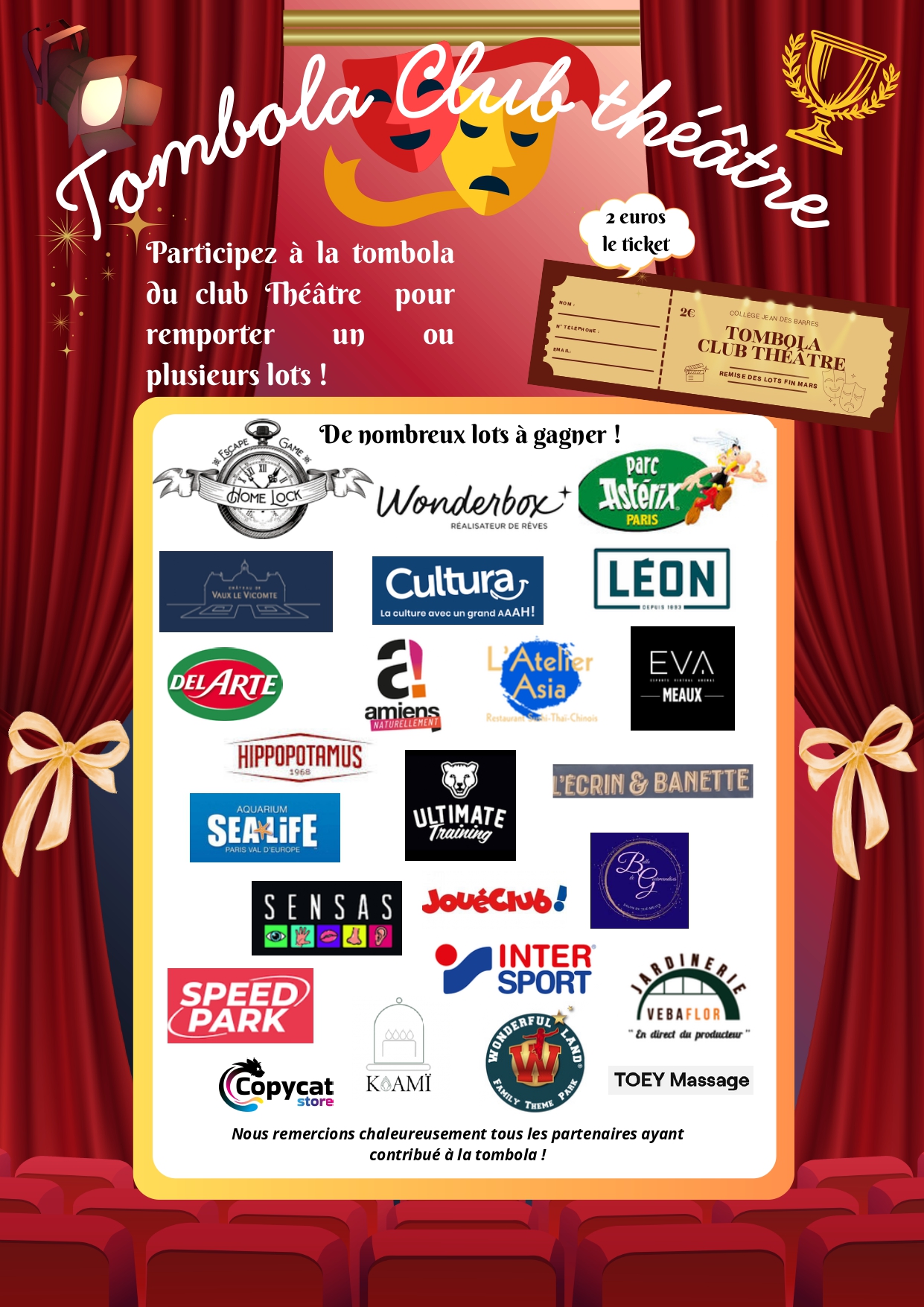 Les tickets sont en vente 2€ pour la Tombola du club Théâtre, nombreux lots à gagner.