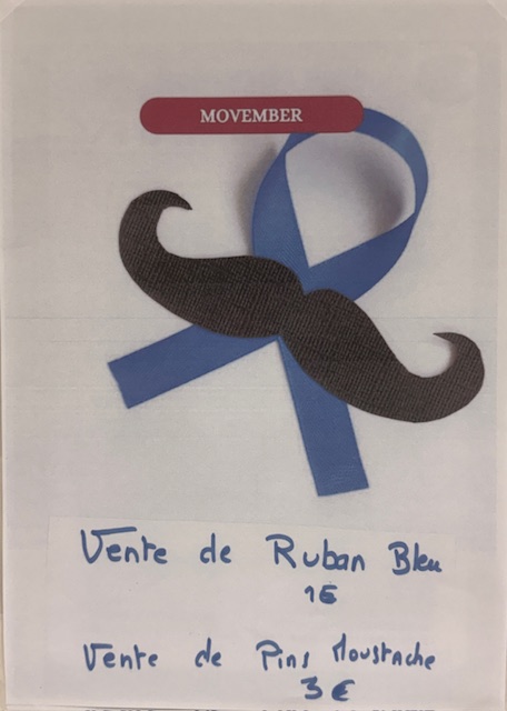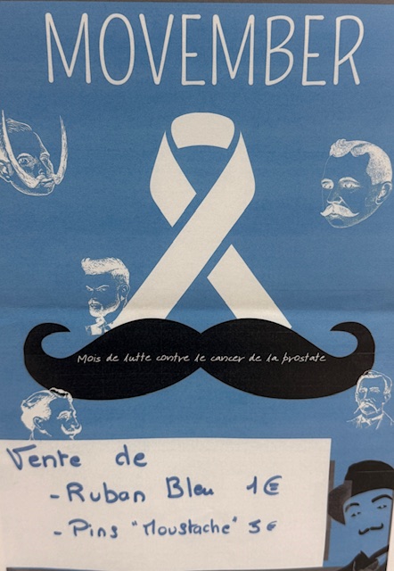 Afin de marquer notre engagement, une vente de RUBANS BLEUS au prix de 1 euro ou de pin's à 3 euros a été organisée au sein de l’établissement le LUNDI 17/11/2025 pendant les interclasses au niveau du hall d’entrée du collège au profit de l’association “MOVEMBER”.