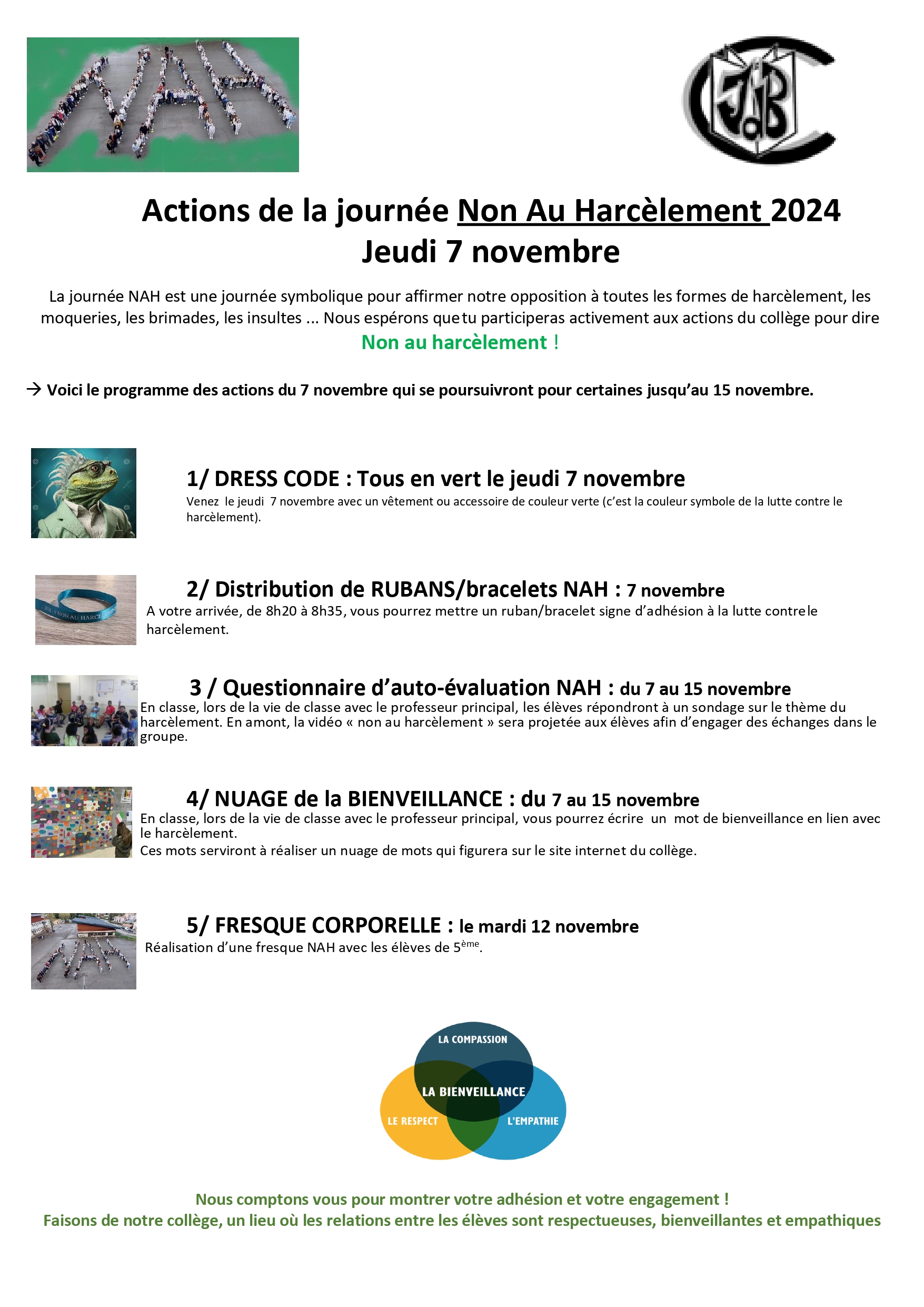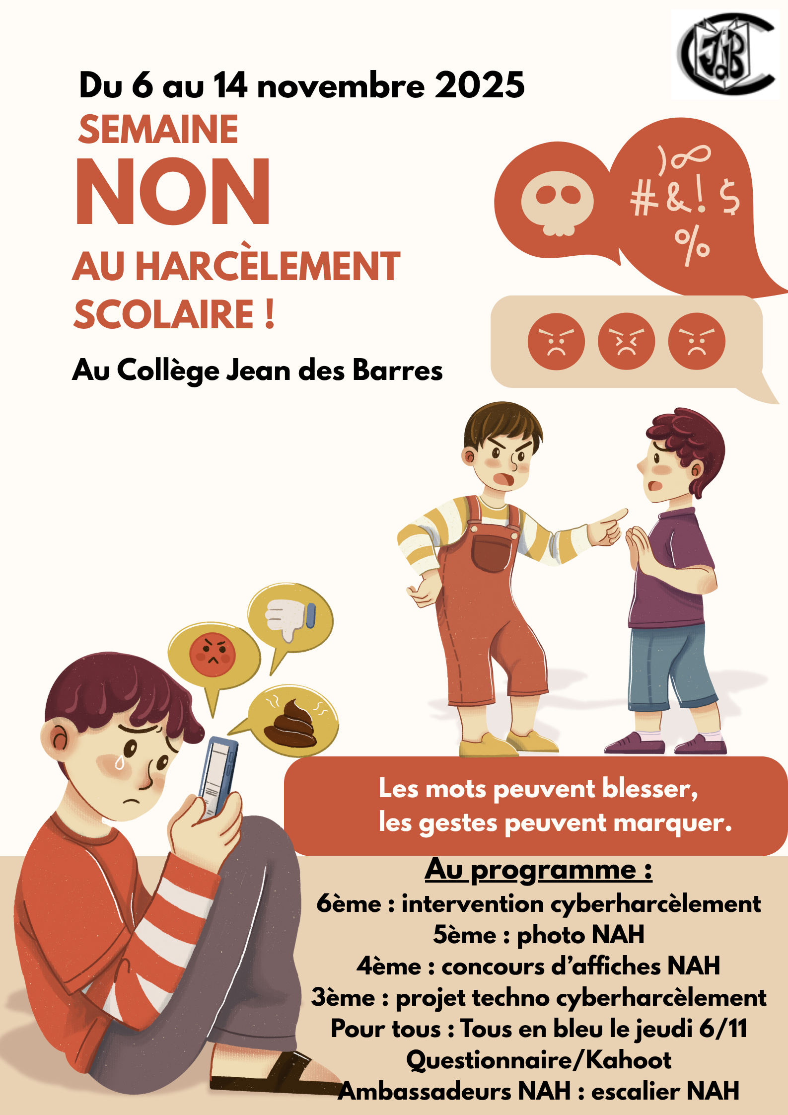 SEMAINE NON AU HARCELEMENT JOUR 2 Cette semaine, tous les élèves de 4ème participent à un projet d'affiches "non au harcelement", [...]