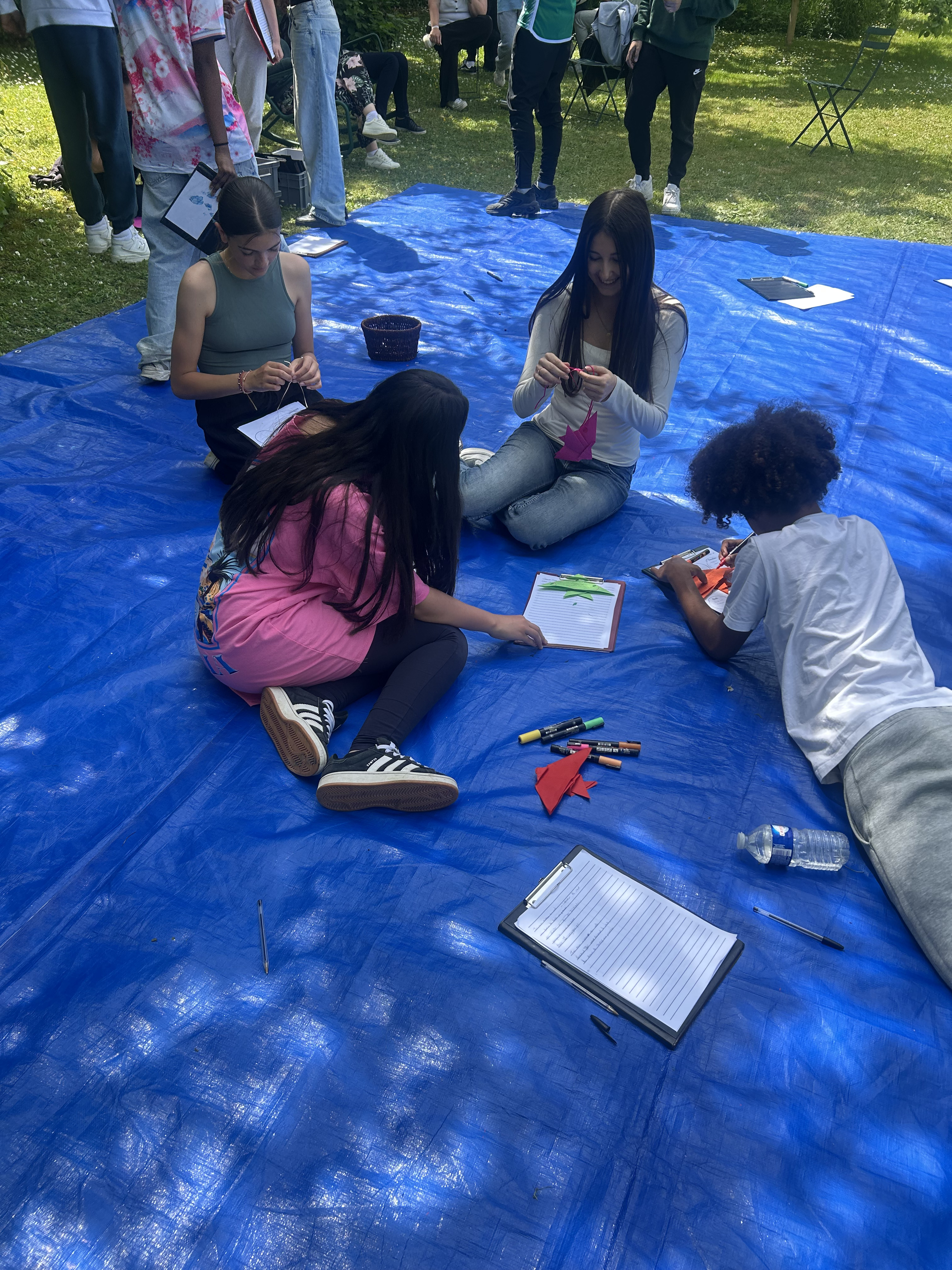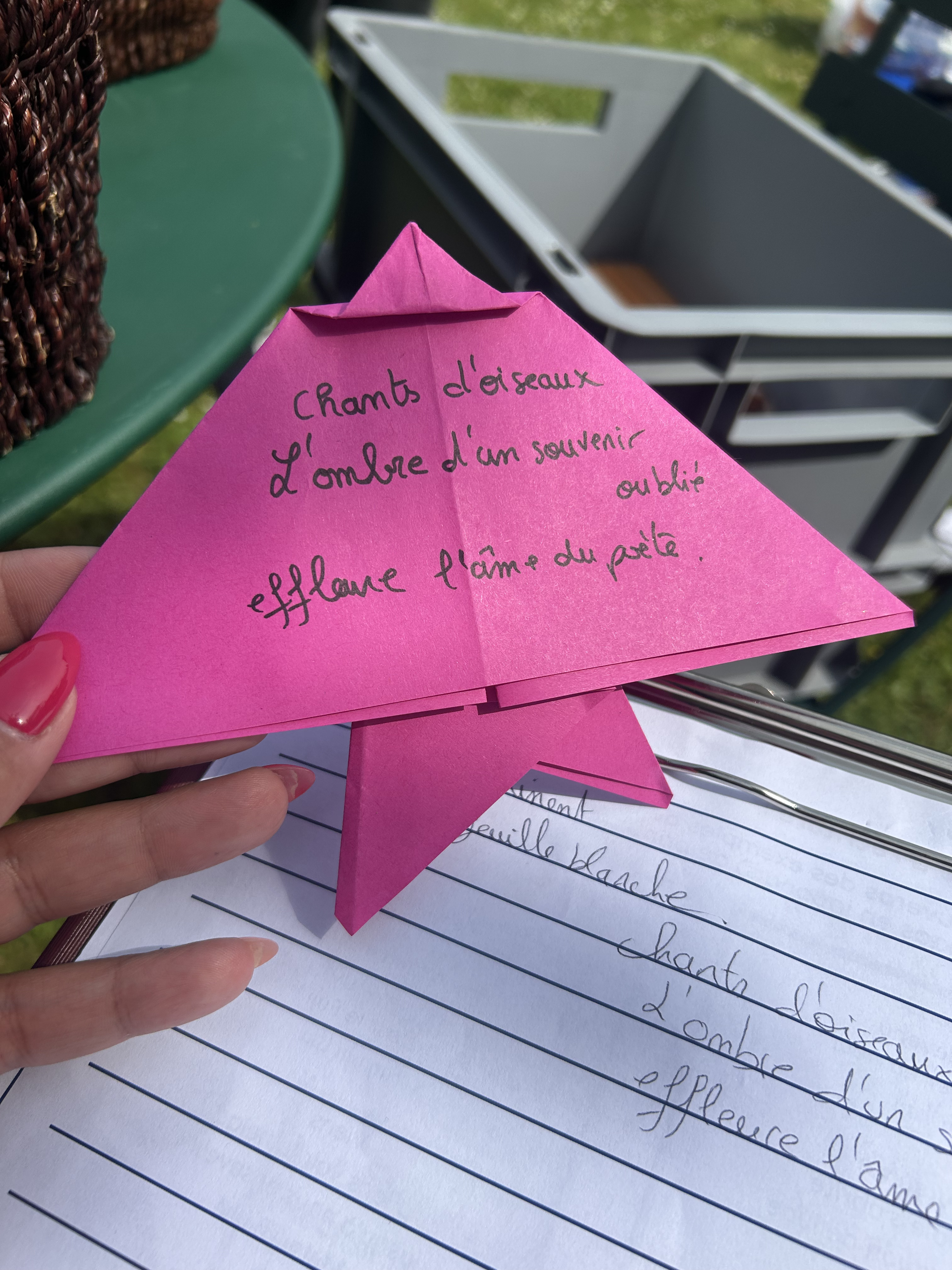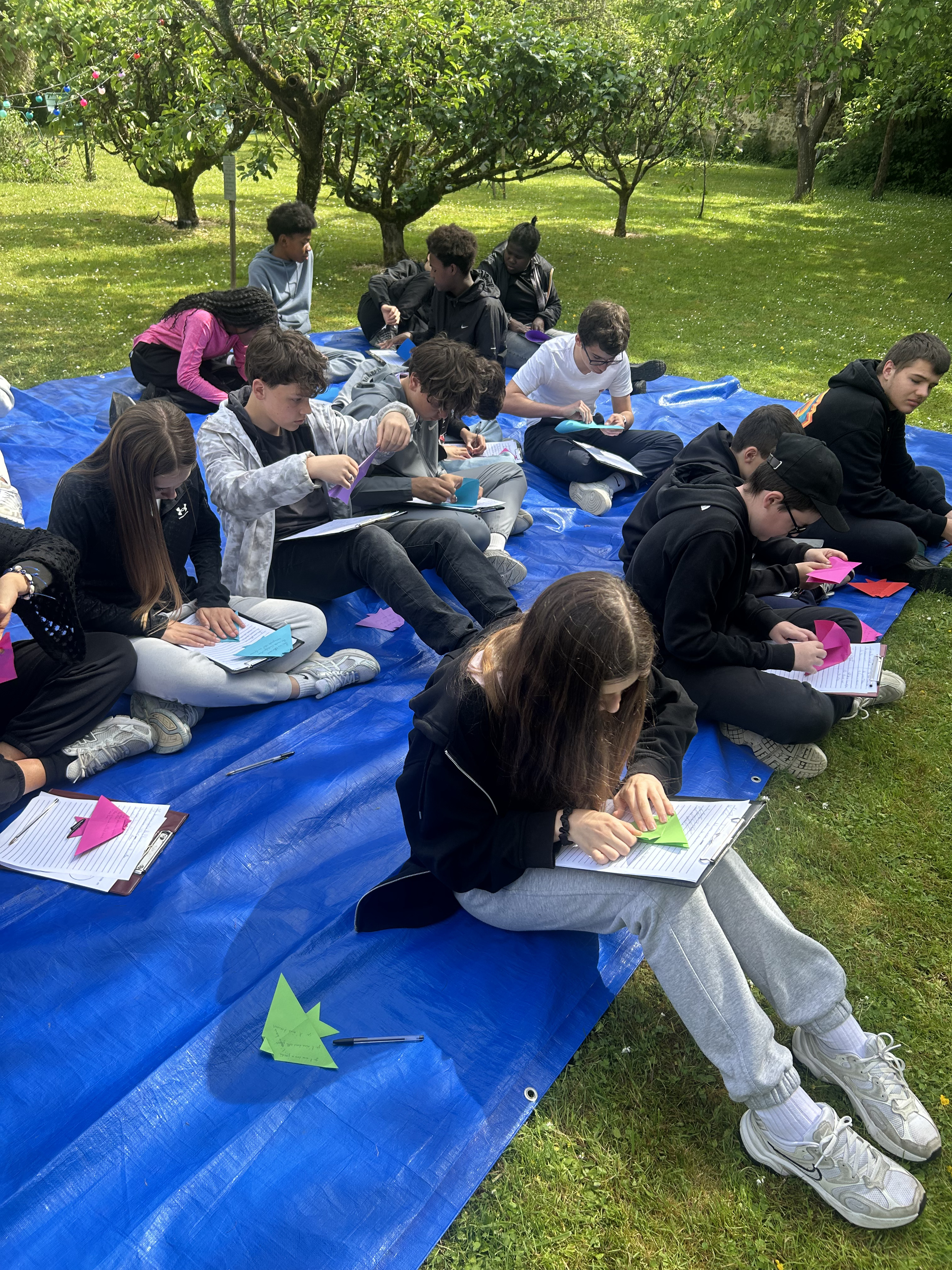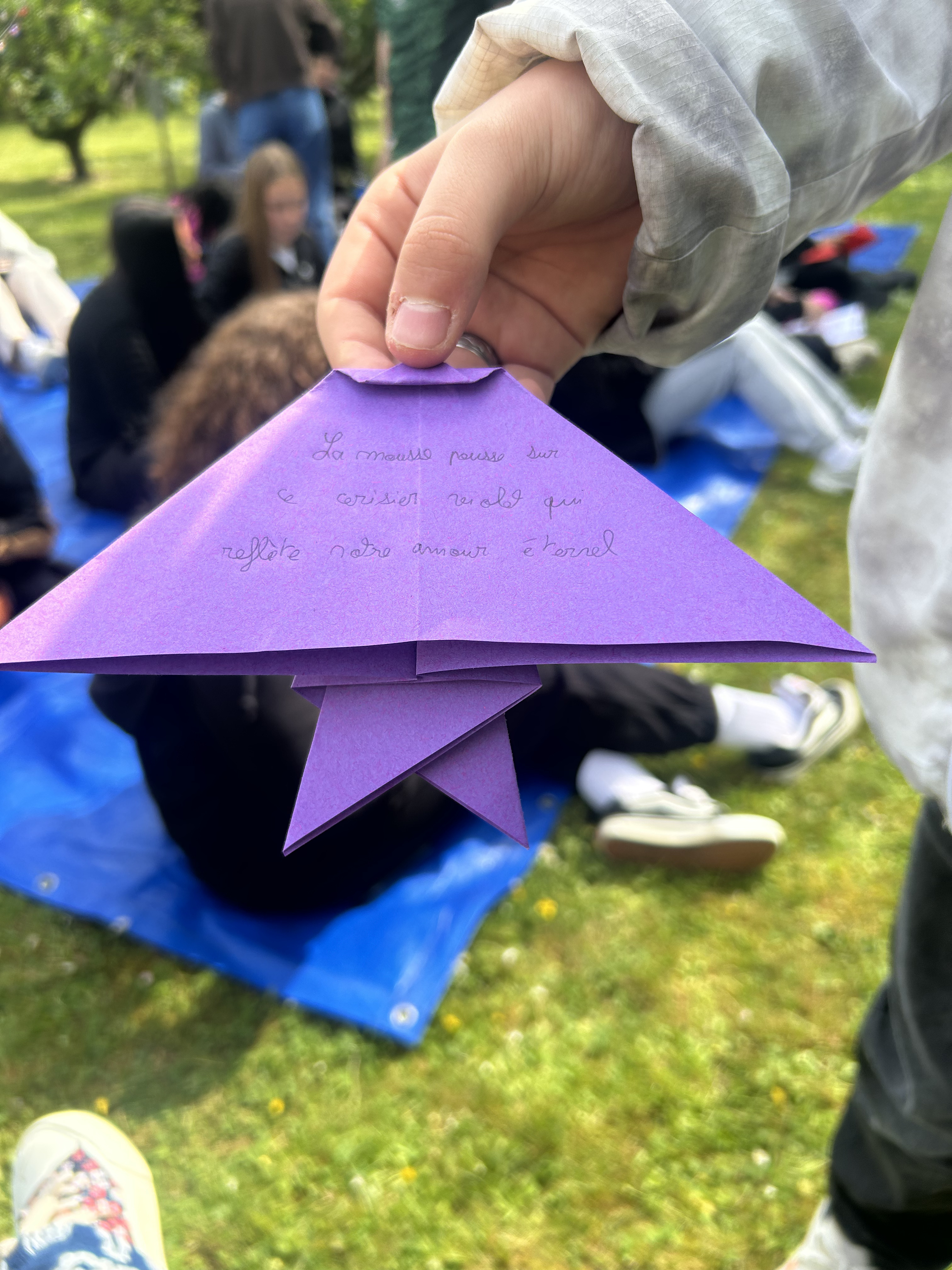 Cette séquence a également été enrichie par une sortie scolaire au musée Départemental Stéphane Mallarmé, situé en bord de Seine. Les élèves ont bénéficié d’une visite guidée du musée, découvrant la vie et l’œuvre du poète symboliste dans le cadre intimiste de sa maison. À la suite de cette immersion, ils ont participé à un atelier d’écriture où ils ont rédigé des haïkus inspirés de leur visite. Ces poèmes courts, chargés d’émotion et de sensibilité, ont ensuite été inscrits sur des origamis qu’ils avaient eux-mêmes réalisés, mêlant ainsi art du pliage et poésie.Le déjeuner convivial sur les bords de Seine, a favorisé les échanges et le partage d’impressions dans un cadre bucolique propice à l’inspiration.
